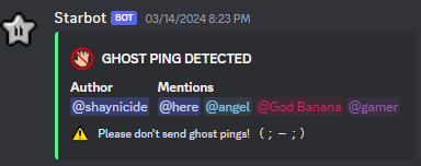 Can be enabled to send an alert in-channel when someone sends a mention (ping) and deletes it. Types of mentions (<mark style="color:yellow;">everyone/here, roles mentions, individual user mentions</mark>) can be toggled individually.&#x20;
