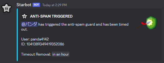 <mark style="color:yellow;">Response Level (1-5)</mark> controls the strictness of the anti-spam trigger, while <mark style="color:yellow;">Handling (1-5)</mark> controls what happens when triggered (length of timeout). Also deletes the offending messages.